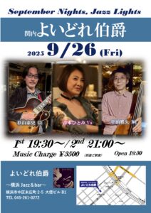 1st/ 19:00〜20:10、2nd/ 21:00〜22:10共演 青木弘武Pf 河原秀夫Ba 西川彩織Dr