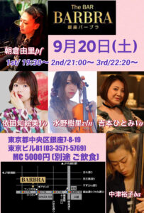 19:30〜、21:00〜、22:20〜【共演】朝倉由里(Pf) 中津裕子(Ba) 水野樹里(Vln)・依田知絵美(Vo)