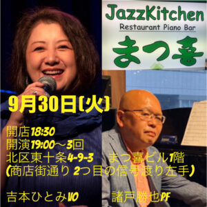 18:00〜、19:30〜、21:00〜吉本ひとみ(Vo) 小島幸華(Tp) 松本曹史(Vo &Gt) 城田有子(Pf)