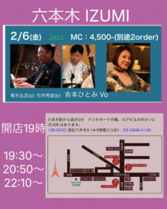 Open19:00 開演19:30〜、20:50〜、22:10〜出演 吉本ひとみVo 青木弘武Pf 竹内秀雄Ba
